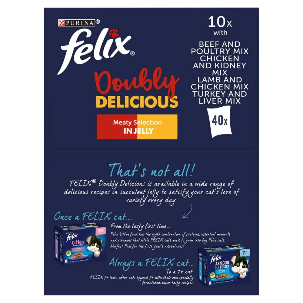 Our FELIX As Good As It Looks Doubly Delicious Adult Cat Meat Selection in Jelly cat food is made with two different types of tender meat or fish, served in a mouth-watering jelly. We’re sure you adult cat will love the variety of flavours available, especially as they’re stored in individual pouches to retain their enticing aromas and tempting textures. Providing your cat with all they need to live a happy life as an adult cat, our FELIX As Good As It Looks Doubly Delicious Adult Cat Meat Selection in Jelly is packed with essential vitamins and minerals to keep your cat supported.