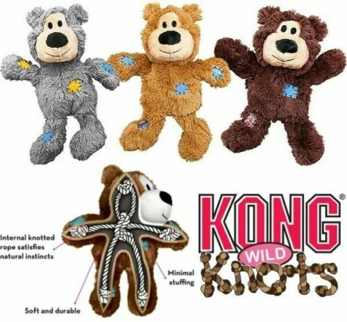 KONG Wild Knots are soft and cuddly on the outside while durable and strong on the inside. Wild Knots bears are sure to be a hit with dogs and their pet parents. Dogs love the knotted skeleton, and the reinforced plush body provides extra durability. KONG Wild Knots have less stuffing for less mess and they squeak to entice play.