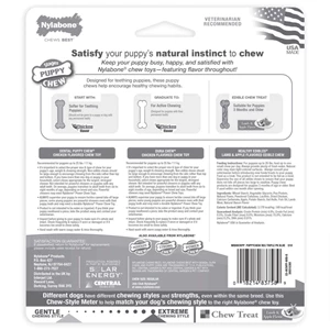 Develop healthy chewing habits from the start with The Puppy Starter Kit which includes a soft plastic Puppy Bone for teething puppies before they get any permanent teeth, a Dura Chew chicken-flavoured bone for powerful puppy chewers and puppies starting to get their permanent teeth, and a Blue bone Chicken flavoured.