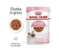 ROYAL CANINĀ® Kitten in Gravy is specially formulated to support the nutritional needs of kittens in the āconsolidation phaseā of their growth. This formula is suitable for 4 to 12-month-old kittens as they undergo a period of significant physical and behavioural changes. This tailored diet offers moist chunks in gravy that are an optimal size, texture and taste for growing kittens.