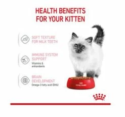 It also contains nutrients such as vitamins C and E to support the development of the kittenās healthy immune system. ROYAL CANINĀ® Kitten in Gravy is also enriched with omega-3 fatty acids (DHA) to support brain development and healthy vision. Thanks to a combination of beneficial prebiotics (MOS) and highly digestible proteins, ROYAL CANINĀ® Kitten in Gravy also helps to support a healthy balance of intestinal microbiota (gut flora) for good digestion.